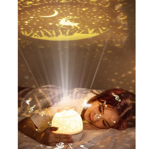 1.Multifunctional-- Can be used as a Projector Lamp when Put Off the Protect Shade, Also can be used as a Night Light when Put On the Protect Shade, can make the music through turning the clockwork